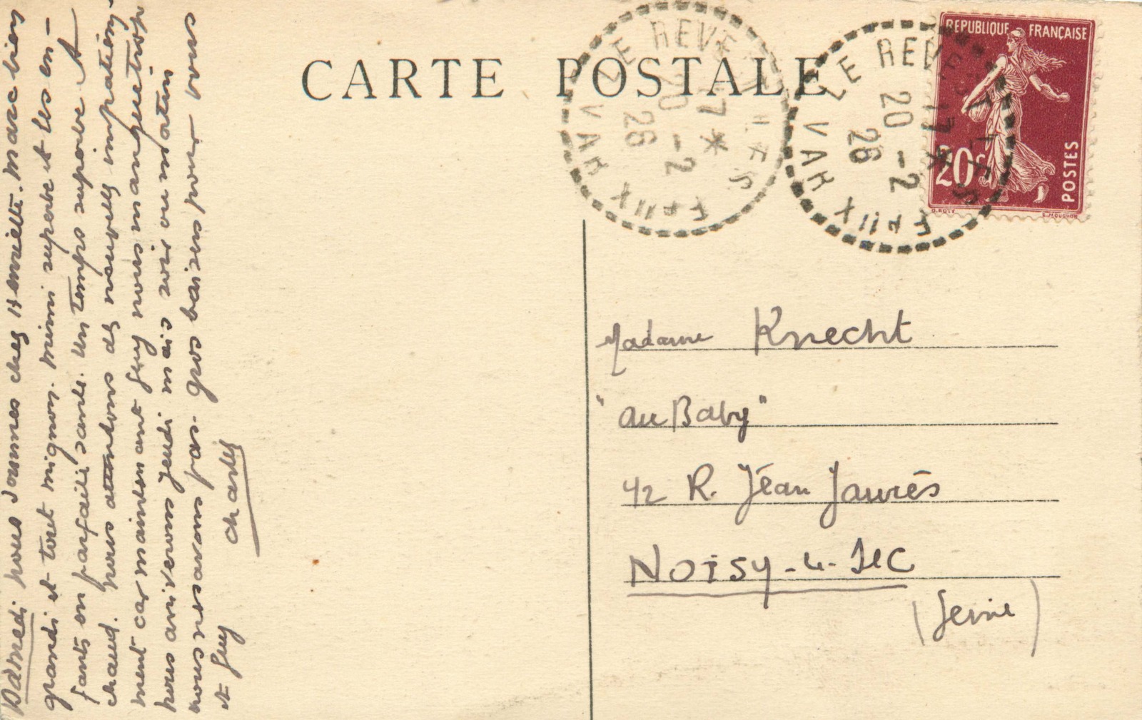 - Verso de la carte Vue du Barrage et du village écrite par Charles Favereau